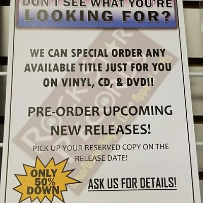If you can not find what you are looking for in our massive CD or Vinyl inventory, we can Special Order just for you. We have access to any available title on Vinyl, CD, DVD, or BluRay!